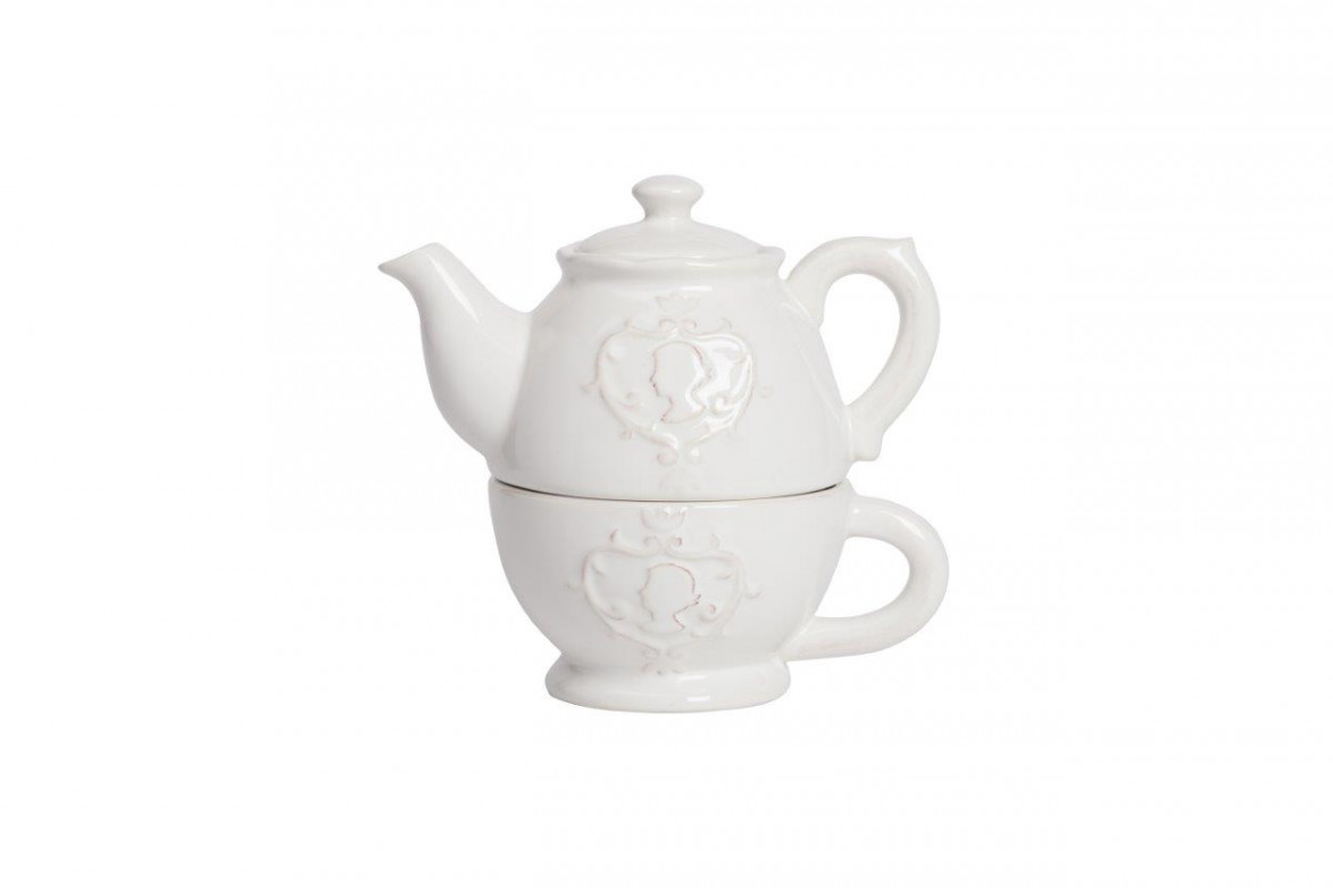 Это чайный набор, созданный специально для истинных леди. Набор состоит из заварочного чайника и большой чашки, выполненных в единой дизайнерской концепции. Форма чашки и чайника подобраны таким образом, что чайник можно поставить сверху на чашку, сэкономив пространство на кухне. Оба предмета выполнены из керамики в белом цвете, на обеих деталях сбоку находятся объемные декоративные узоры и профиль дамы.