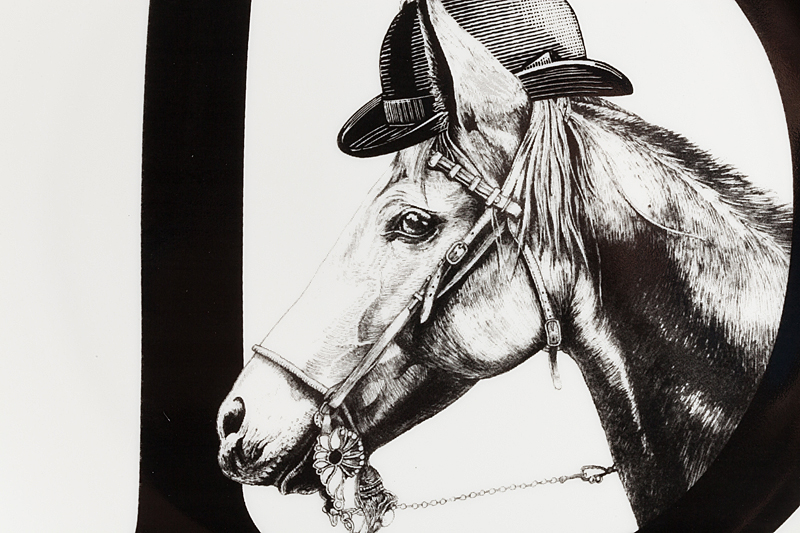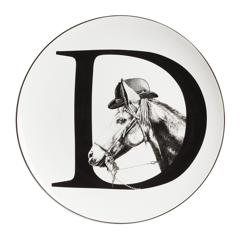 Уникальная тарелка Alfabeto D изготовлена из высококачественного белого фарфора. По краю тарелки проходит тонкая окантовка, дно украшено оригинальным рисунком в виде буквы D, с выглядывающей из неё головой скаковой лошади в котелке. Тарелка декорирована весьма элегантно и заслуживает внимания покупателей.