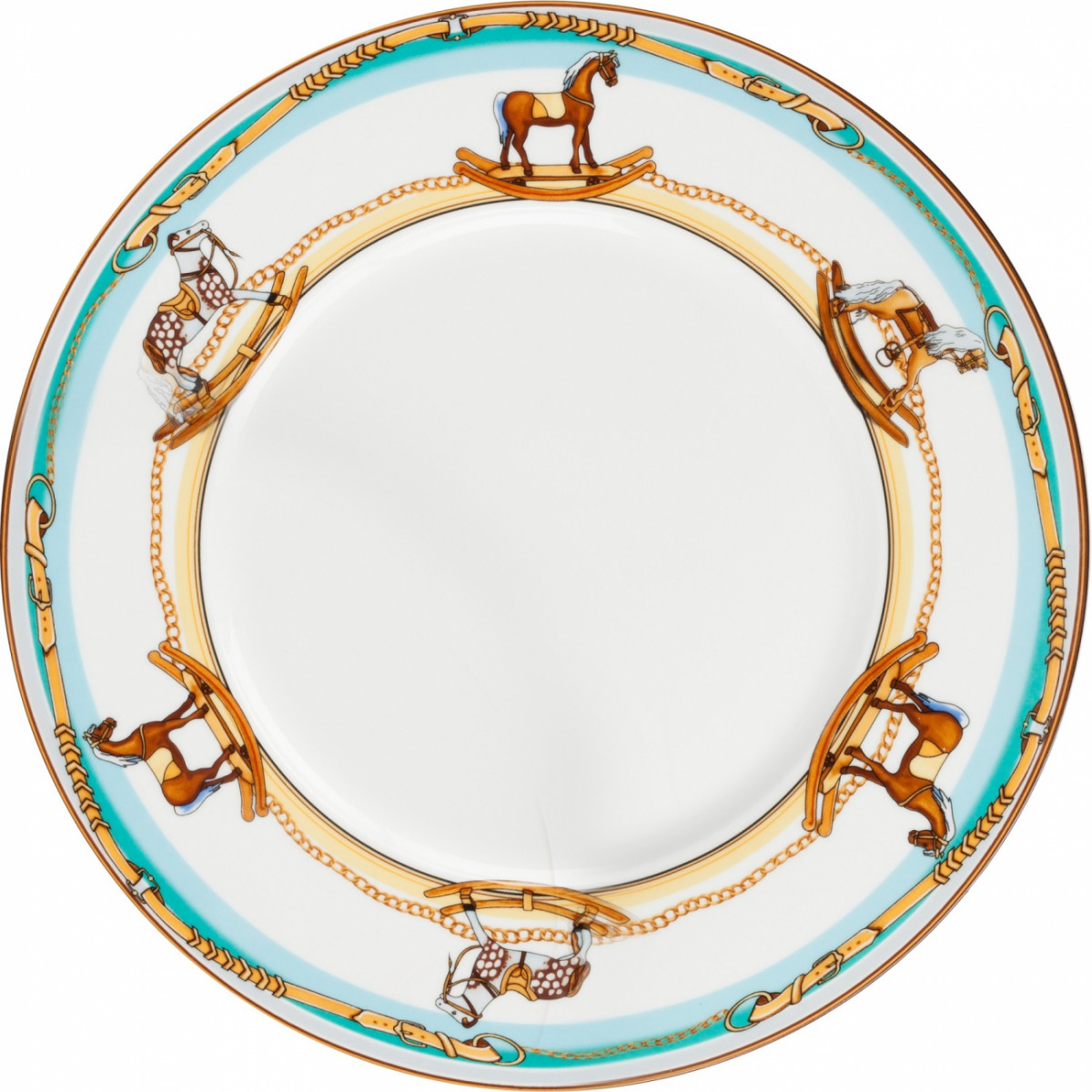Тарелка диаметром 25,5 см выполнена из костяного фарфора. Тарелка расписаны в белом, голубом и оранжевом цвете с изображением игрушечных лошадок-качалок. Такая тарелка, конечно, заинтересует не только взрослых, но и детей. Купите ее в нашем интернет-магазине!